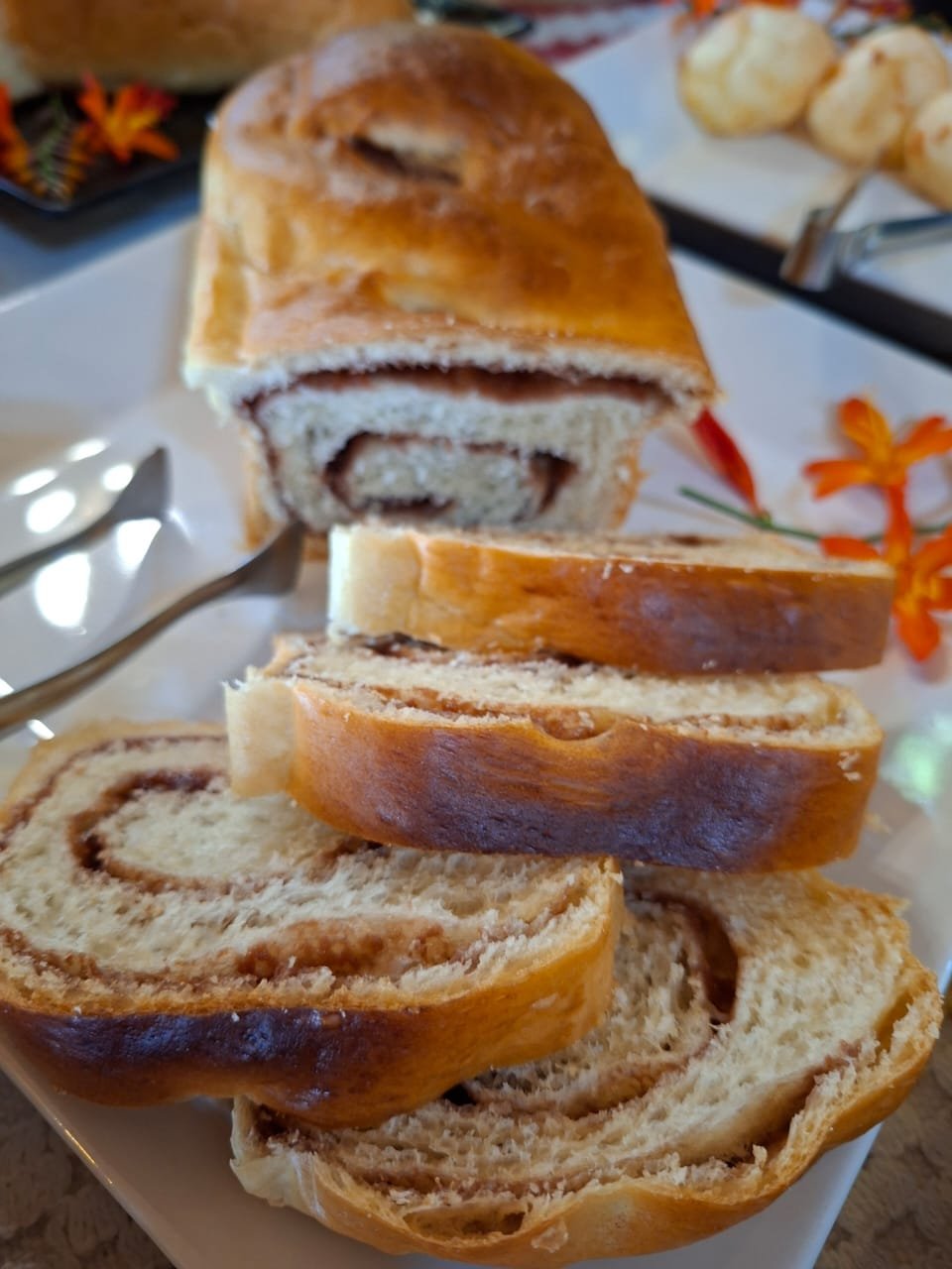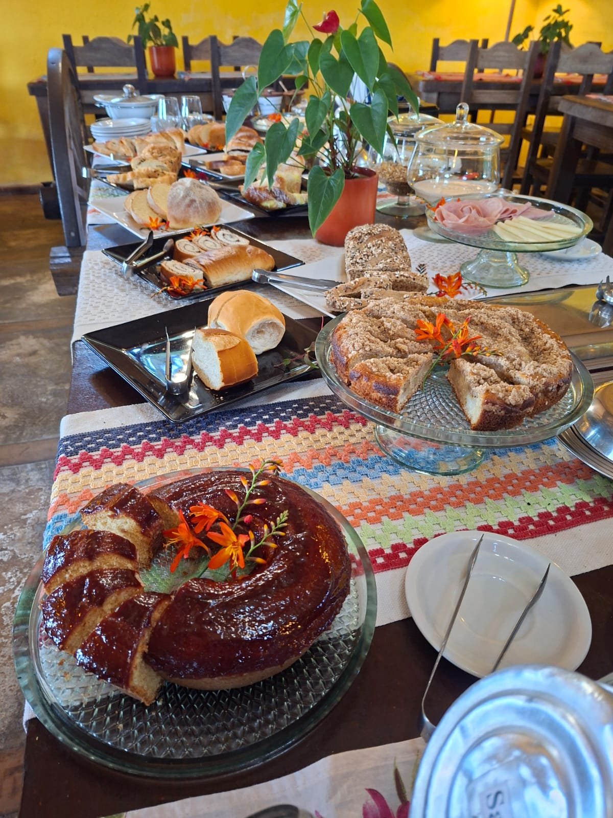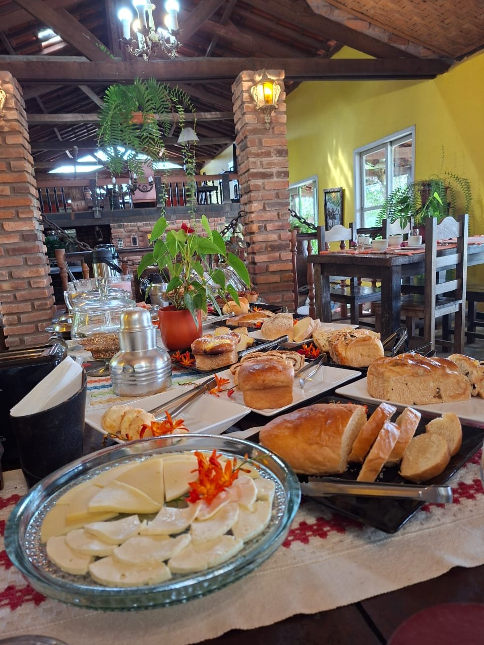Um café da manhã colonial tradicional recheado de produtos saudáveis, feitos em nossa mini padaria.